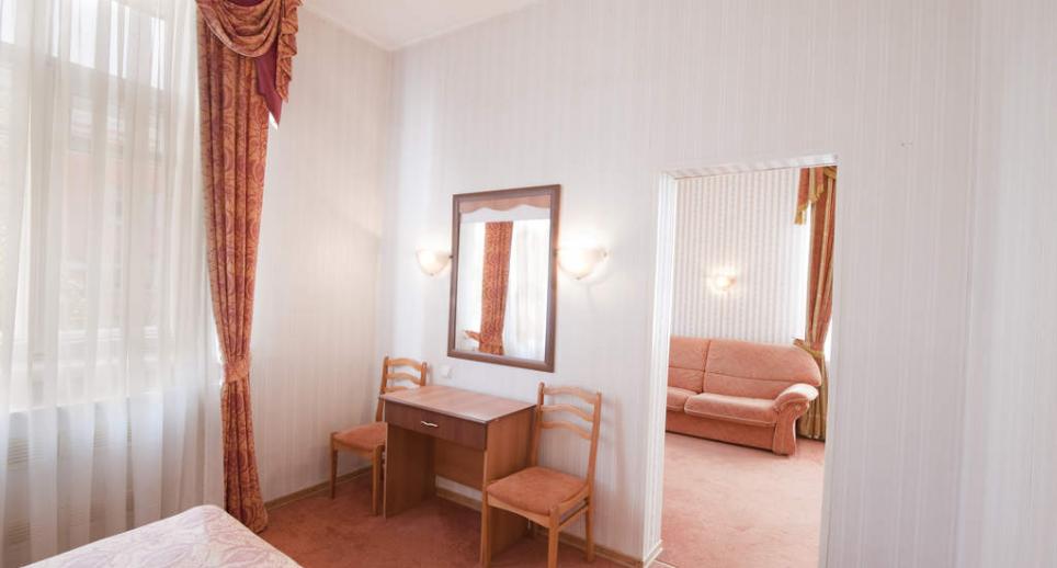 Просторный номер, состоящий из 2-х комнат – спальни и гостиной. Спальня оснащена двумя раздельными либо одной большой кроватью с прикроватными тумбочками. В гостиной возможно размещение третьего человека на диване либо на дополнительной кровати.