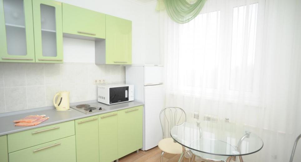На кухне имеется все самое необходимое: кухонный гарнитур, электрический чайник, электрическая плита, холодильник, СВЧ печь и набор посуды на две персоны.