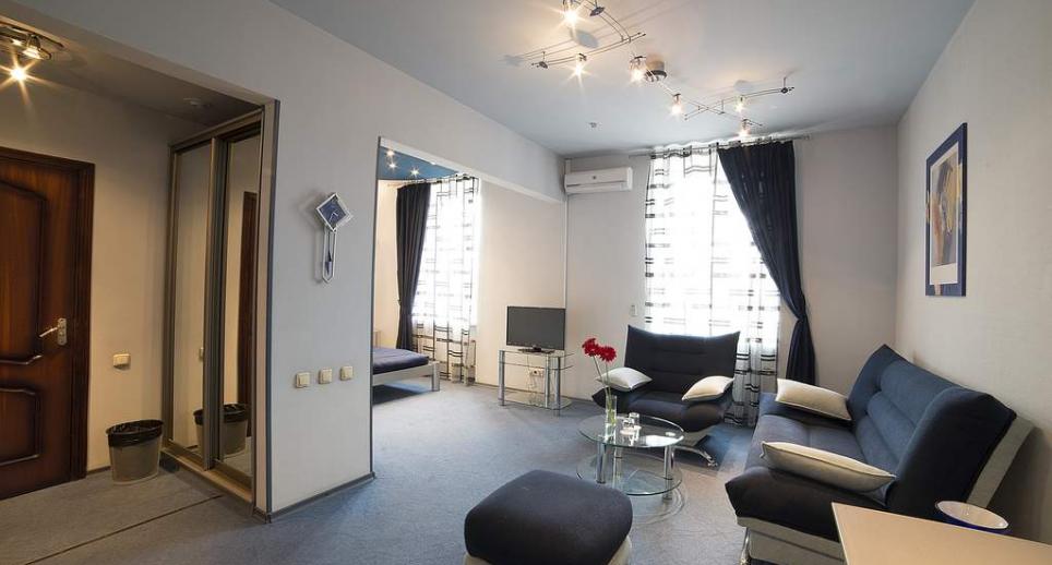 Люкс-Студио "Звездное небо" - светлый номер в синих, голубых и стальных тонах. Его «изюминка» - звездное небо над кроватью.