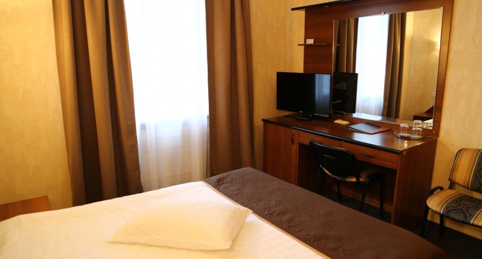 1-комнатный двухместный номер, оборудованный двумя раздельными либо одной большой кроватью с удобными ортопедическим матрасами, рабочим столом и стульями. Также оснащен необходимой техникой - телевизор, холодильник, телефон. В номере - полный санузел с комплектом полотенец и косметическими принадлежностями, оснащенный импортной сантехникой.