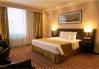 В номере одна большая кровать размера 180*200, рабочий стол, кресло и журнальный стол, телевизор, центральная система климат-контроля, чайная станция, холодильник и гладильный центр с утюгом.